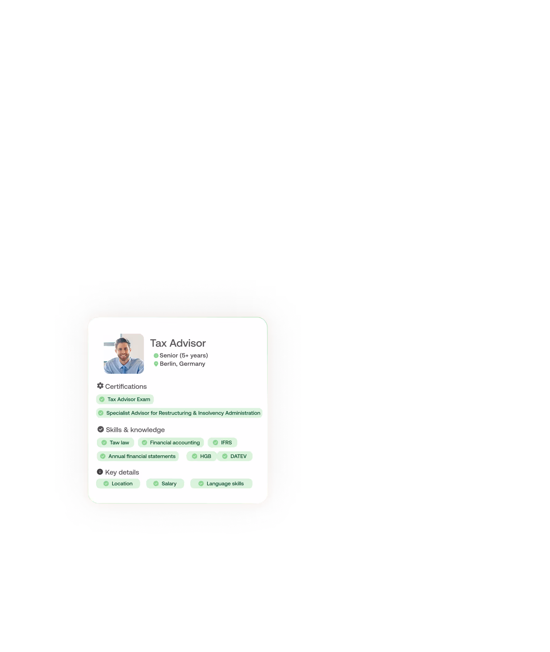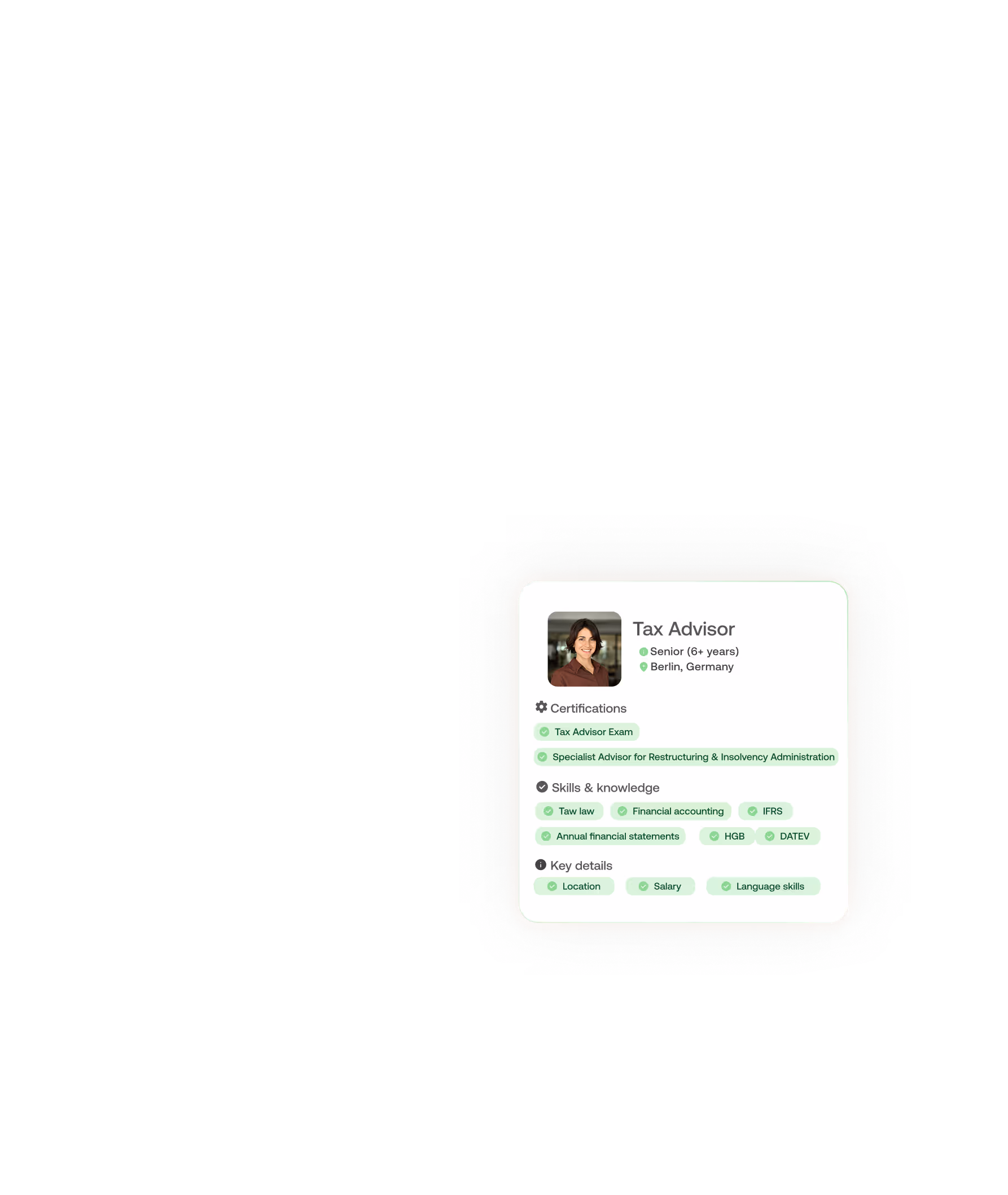 On Instaffo, you’ll find over 10,000 certified and quality-verified tax and finance professionals you won’t find anywhere else.