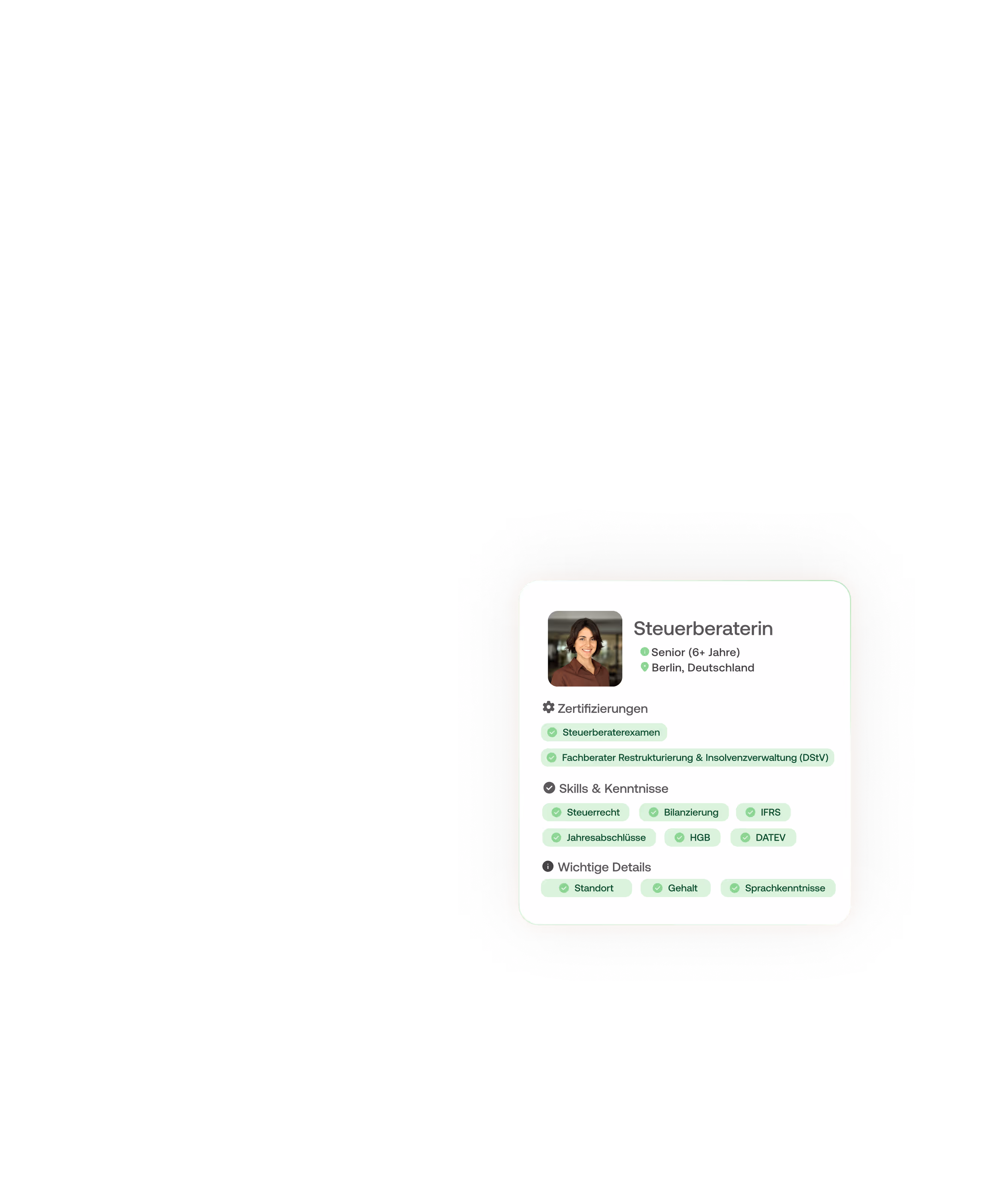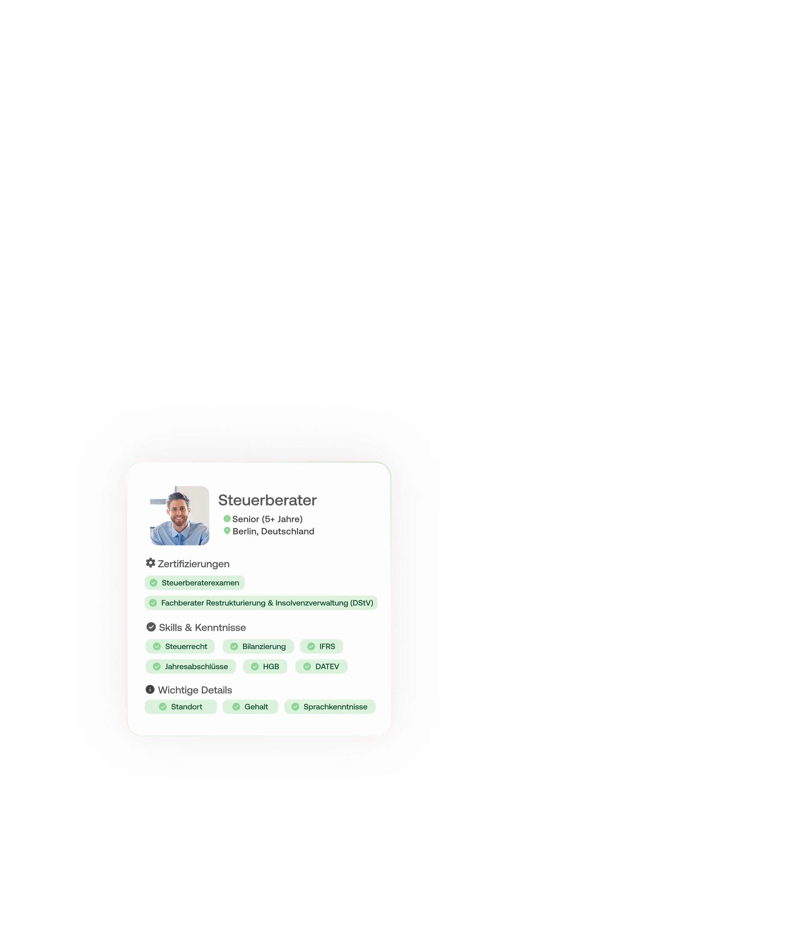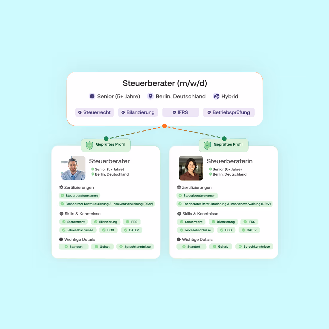 Unsere Matching-Technologie geht über Schlagworte hinaus: Sie analysiert Fähigkeiten, Präferenzen und Soft Skills semantisch. Zusätzlich durchlaufen alle Talente einen Qualifizierungsprozess – das bedeutet für dich höhere Qualität bei weniger Aufwand.