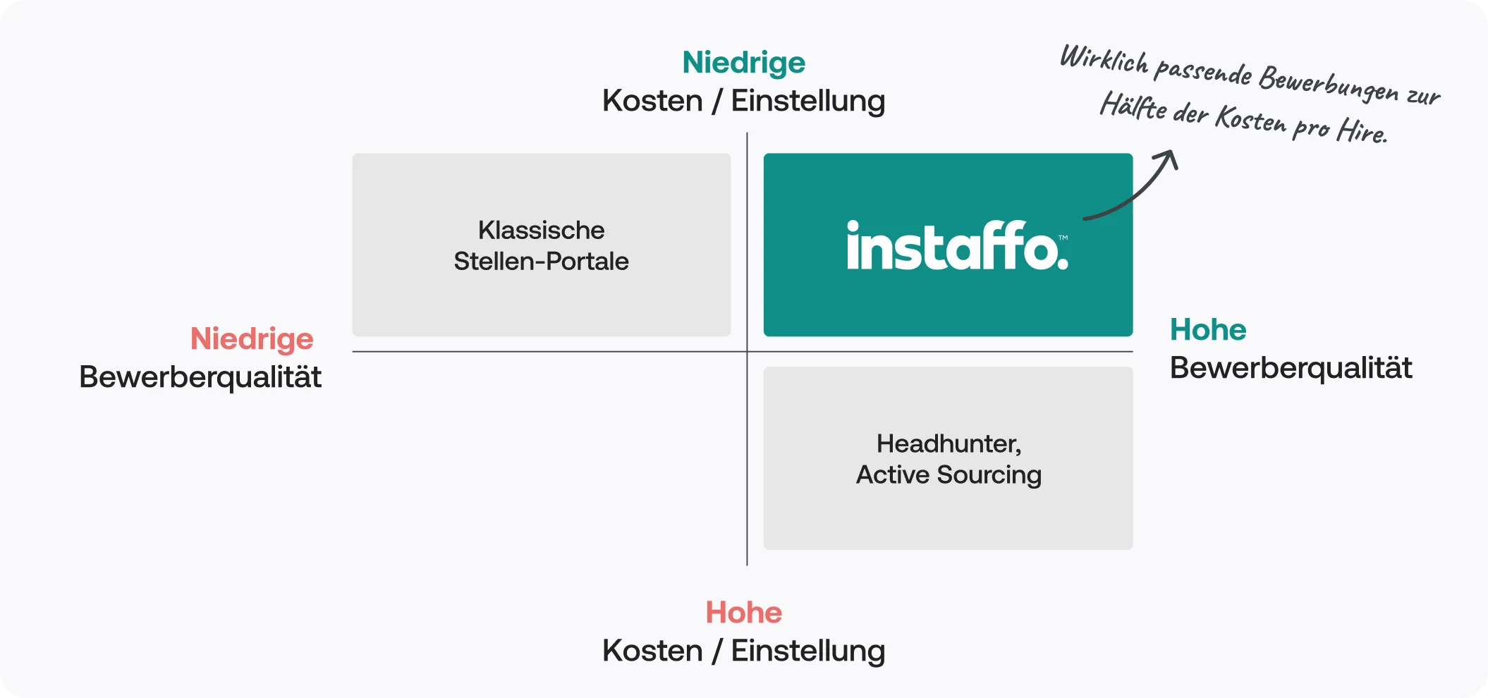 Bei Instaffo ist jede 14. Bewerbung eine Einstellung. Andere Jobplattformen brauchen dafür 50 Bewerbungen. Und das bei einer durchschnittlichen Kostenersparnis von 54%.